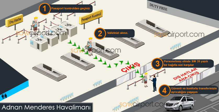 Adnan Menderes Havalimanında uçaktan indikten sonra dış hatlar yolcularımız pasaport kontrol noktasından çıkış yapmaları gerekmektedir.(Not: Dikkat edilmesi gereken hususlardan birisi karşılama personelimiz sizi pasaport noktasında beklememektedir.)